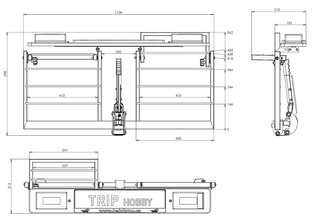 nosič HOBBY s rozměry ložné plochy 1100x455mm pro univezrální použití je opatřen sklomnými bočnicemi, které lze nastavit až do 7 poloh a nosič tím prodloužit až na 1100x562mm